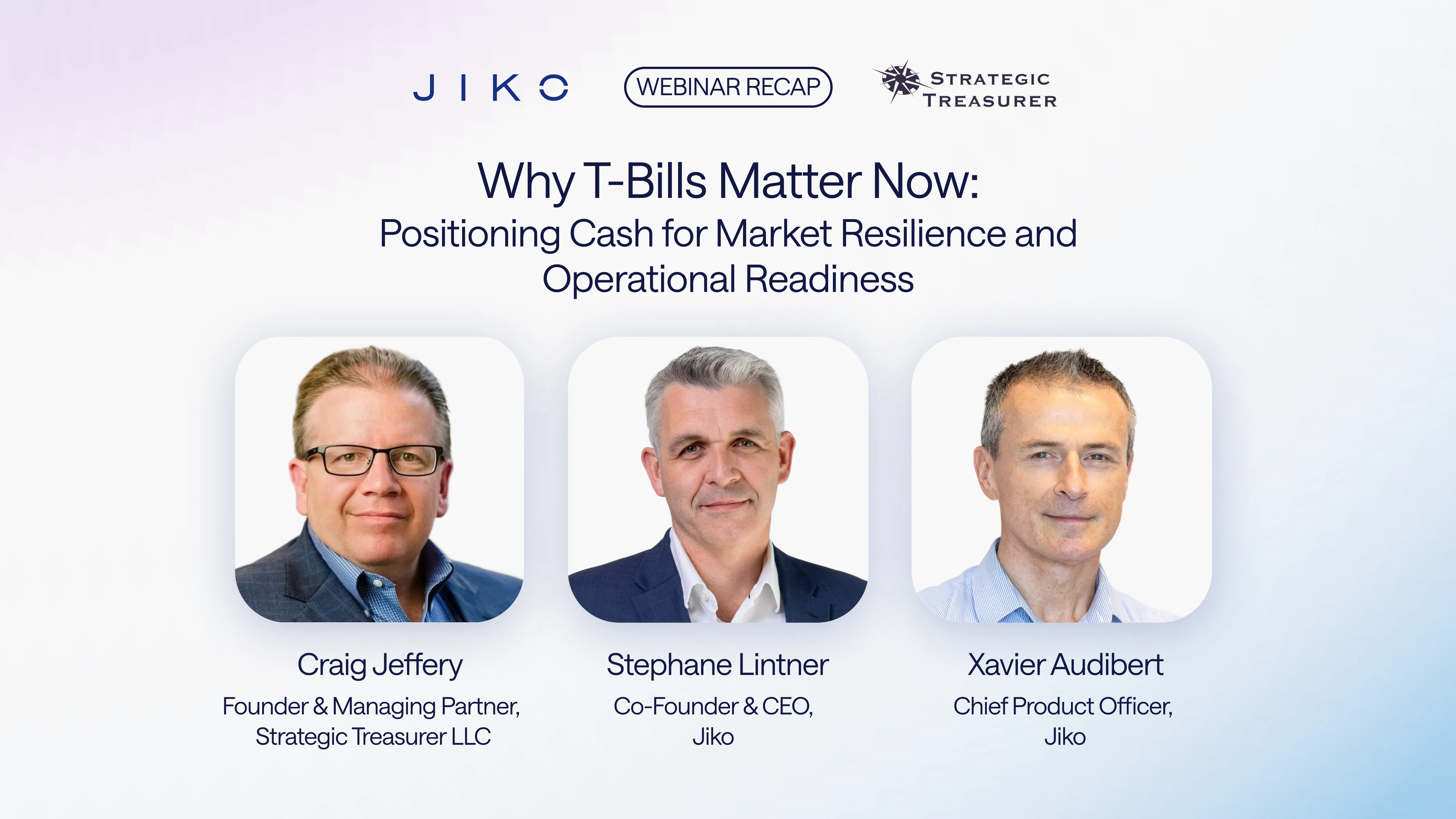 In a recent webinar hosted by Strategic Treasurer, Jiko’s CEO Stephane Lintner and Head of Product Xavier Audibert joined Craig Jeffery for a practical briefing on how treasury teams can strengthen their 2026 strategies to best position cash to ensure obligations can be met under any market condition.