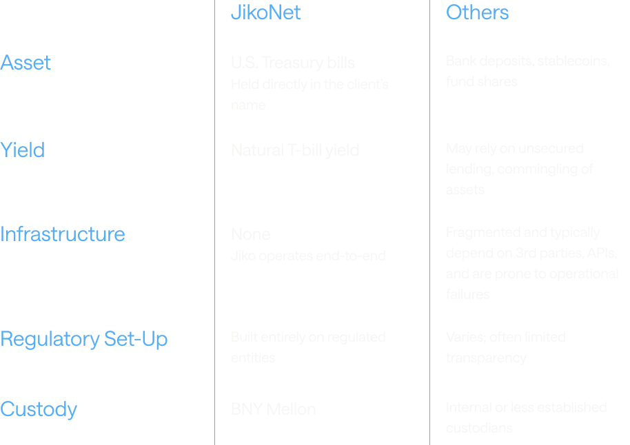 Counterparty Risk: Jiko owns and operates both a regulated national bank (Jiko Bank) and a FINRA-registered broker-dealer (Jiko Securities, Inc.), with asset custody at Bank of New York Mellon, ensuring full control and transparency across the entire stack.